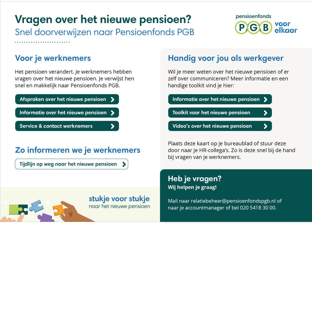 Hebben je werknemers vragen over het nieuwe pensioen? Pak het spiekkaartje erbij. Hierop staan directe verwijzingen naar de informatie voor jezelf en voor je werknemers. Ook handig voor HR-collega’s en/of voor leidinggevenden.